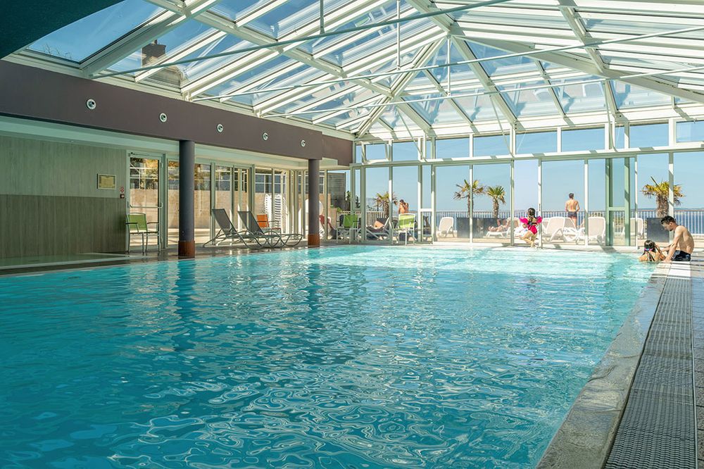 Piscine intérieure sous verrière chauffée toute l’année et un solarium, avec vue mer.